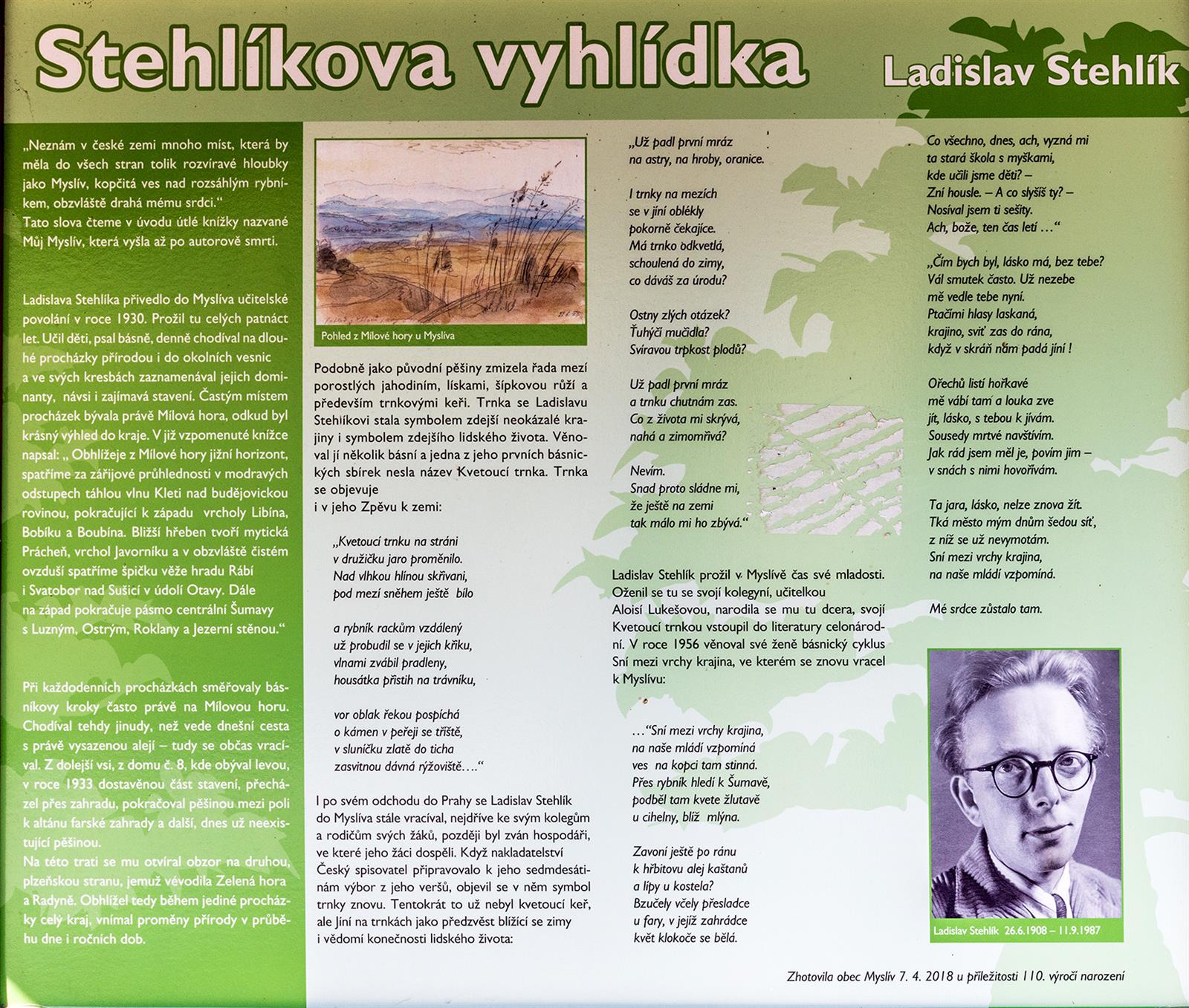 Na jedné z nejkrásnějších vyhlídek na panorama Šumavy rád sedával a nechal se inspirovat básník, spisovatel a malíř Ladislav Stehlík, který v letech 1930 až 1945 působil v Myslívě jako učitel v obecné škole.
