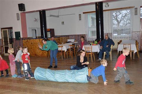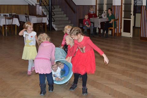V sále v kulturního domu se sešla skupinka dětí, která se těšila na příchod Mikuláše. Dlouhou chvíli čekání si děti krátily hraním, posloužil jim k tomu látkový tunel, se kterým se pěkně vyřádily.